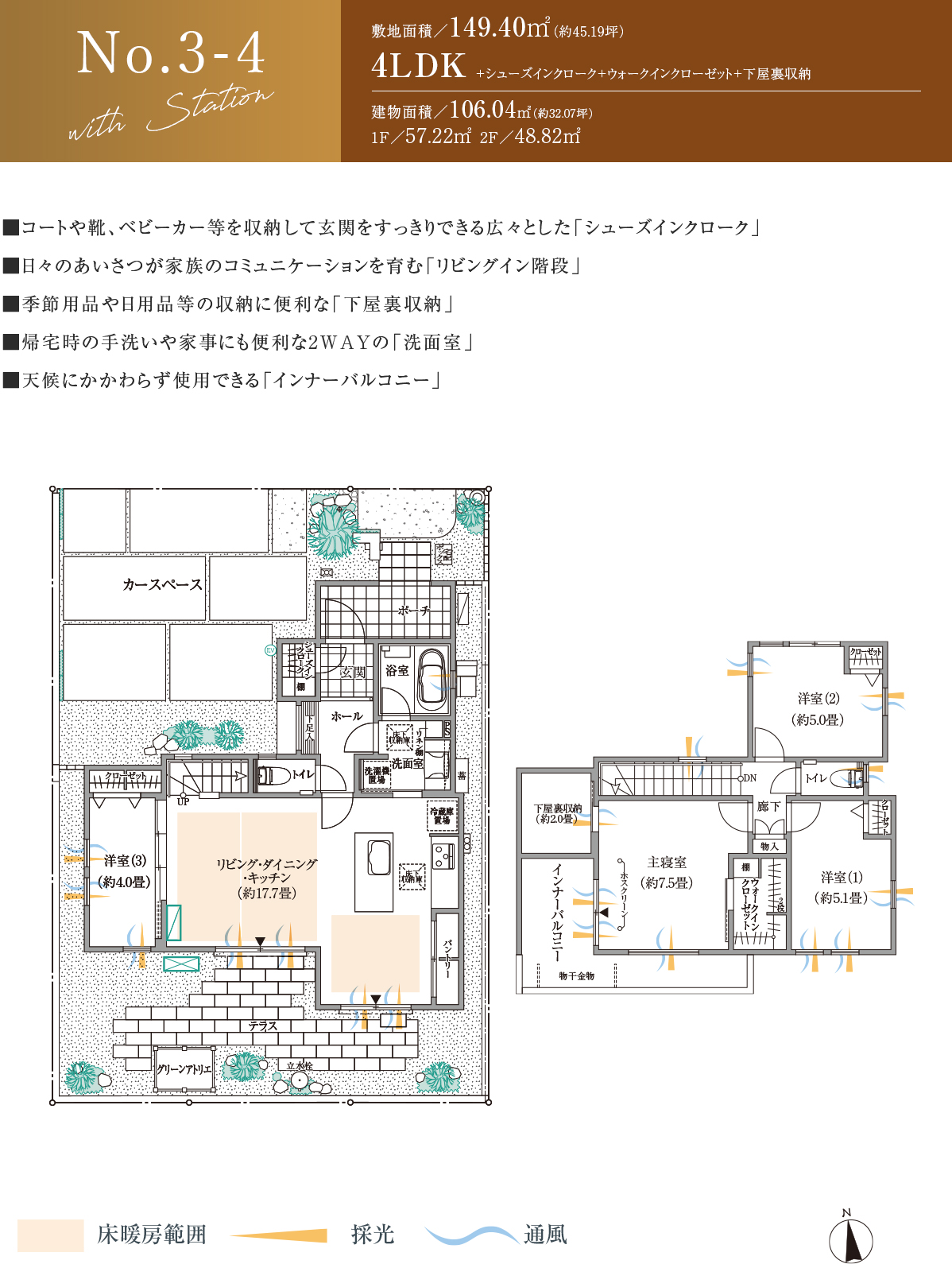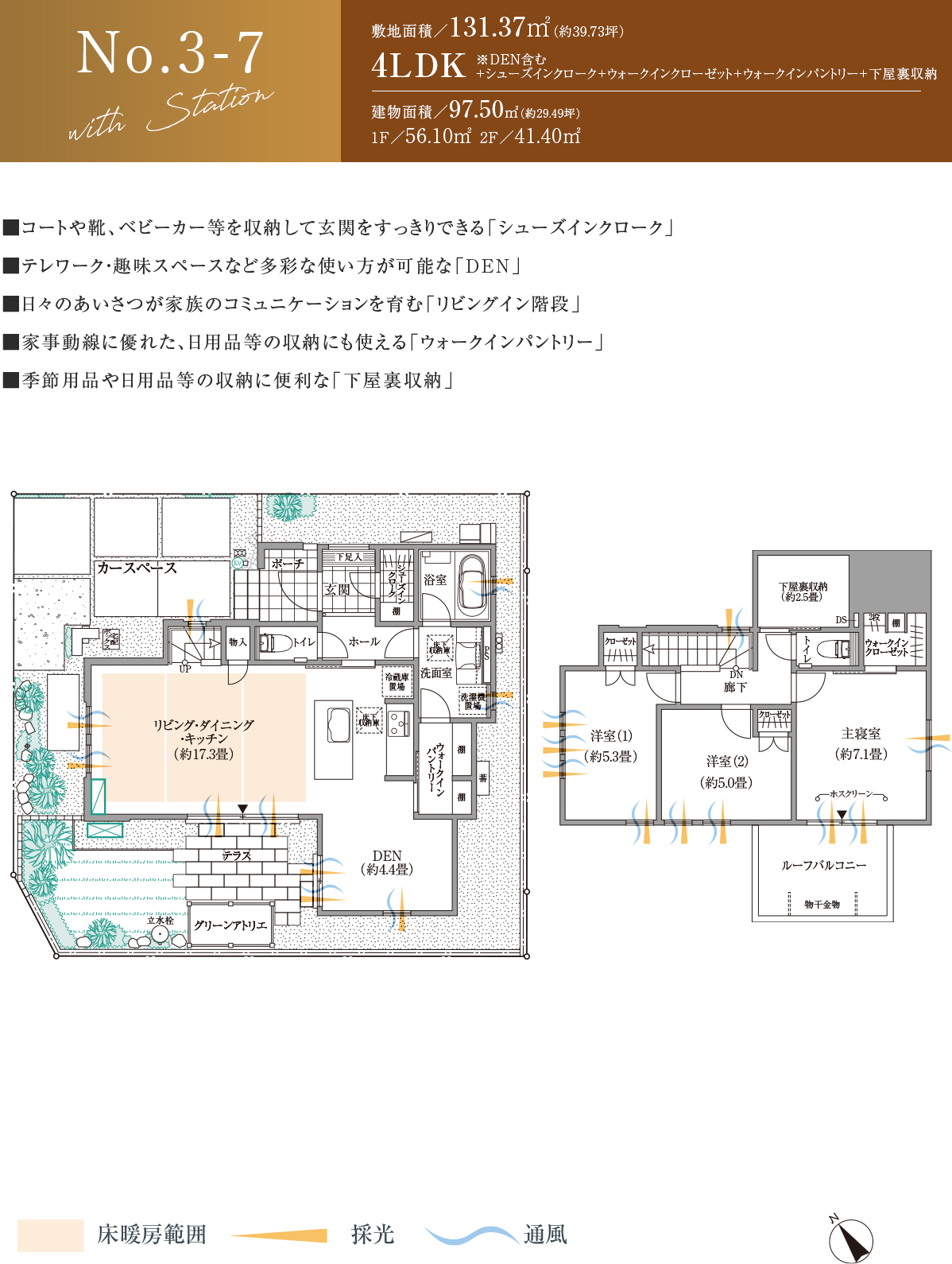プランでは、開放感いっぱいのリビングやフルフラットキッチン、